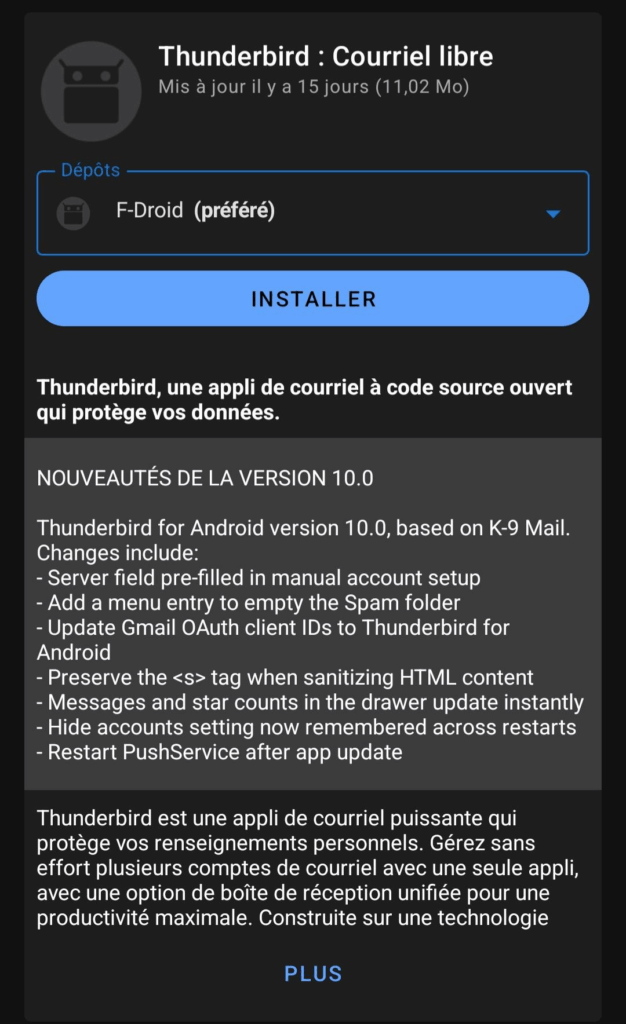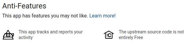 F-Droid (and alternatives such as G-Droid – we are here in the “free world”, so choices are allowed !) only proposes Free Software, meaning applications that allows the user to see the source-code. It may not be meaningful for you, but it changes everything: even if only 1% of the community actually reads the source-code, it makes “undocumented features” impossible to be hidden. It allows the repository to inform you about “Anti-Features” (“features you might not like“) and other issues.