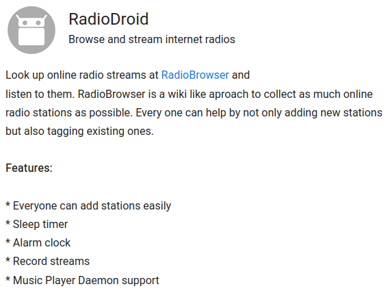 RadioDroid, a universal radio-streams client, allowing world-wide radio channel listening.