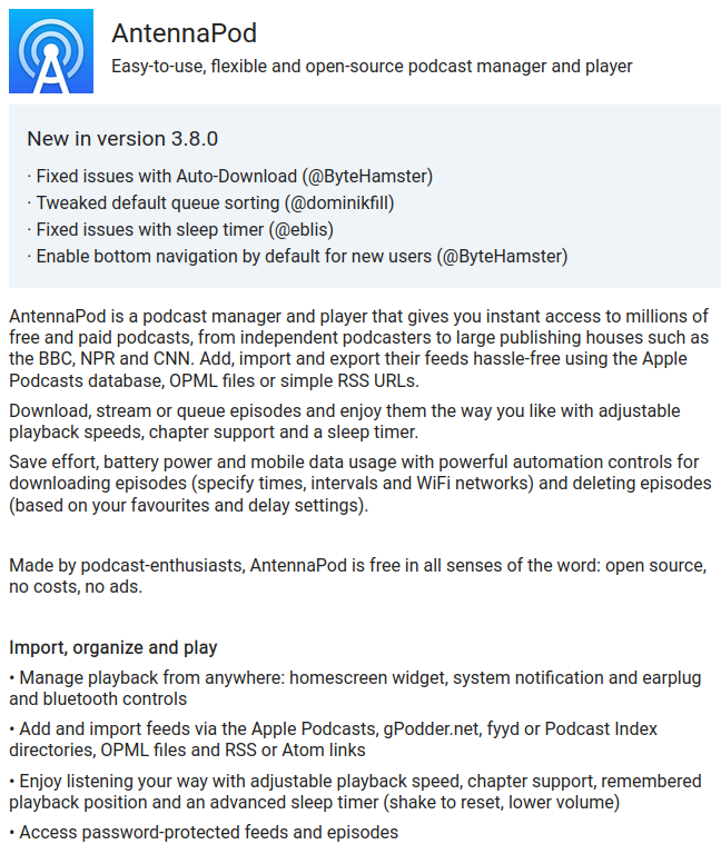 AntennaPod, the universal client for podcasts, allowing automatic nightly downloads, bringing you the channels you want to listen to available in cars, sport, office, bike, … without network connexion issues.